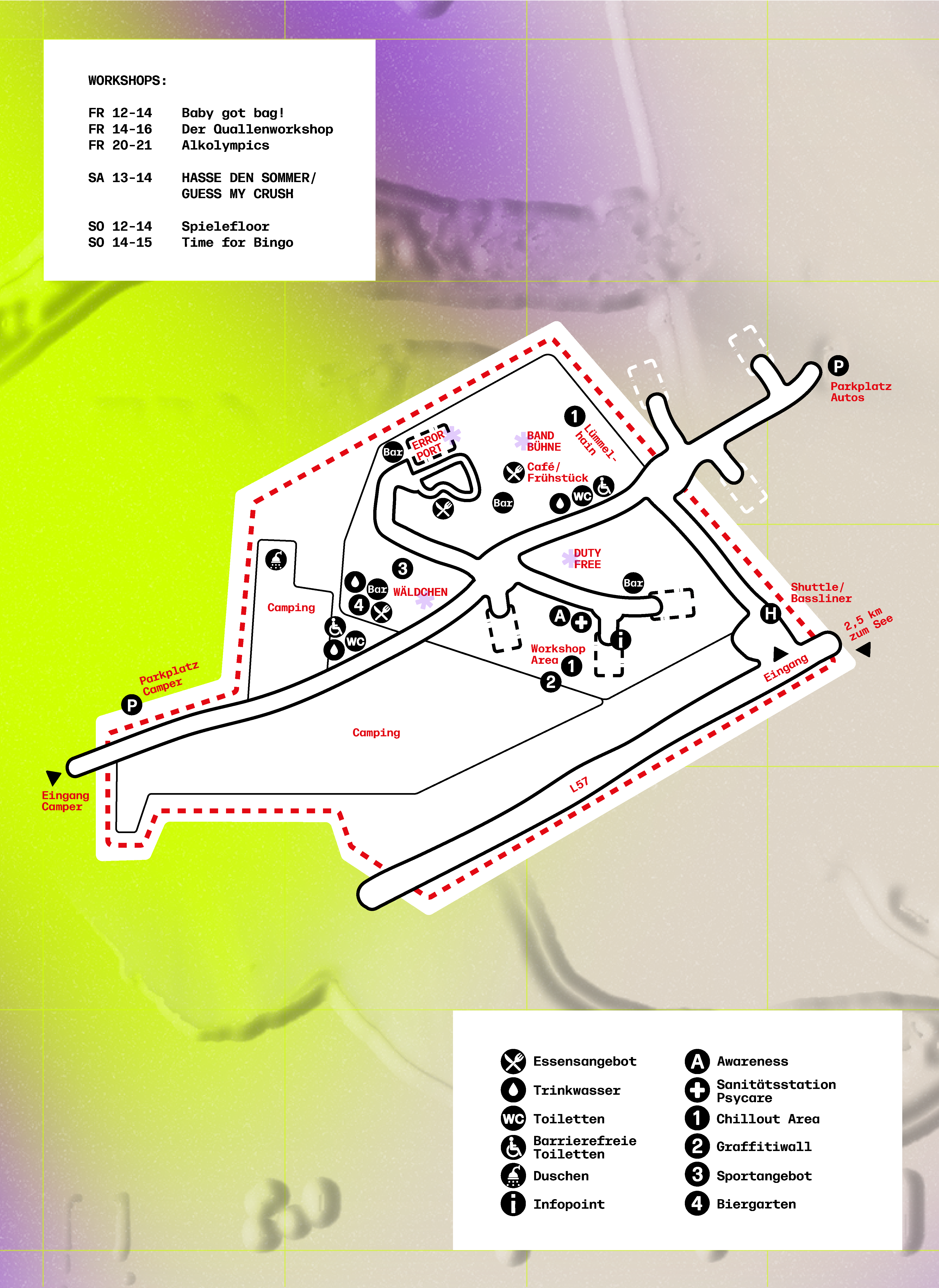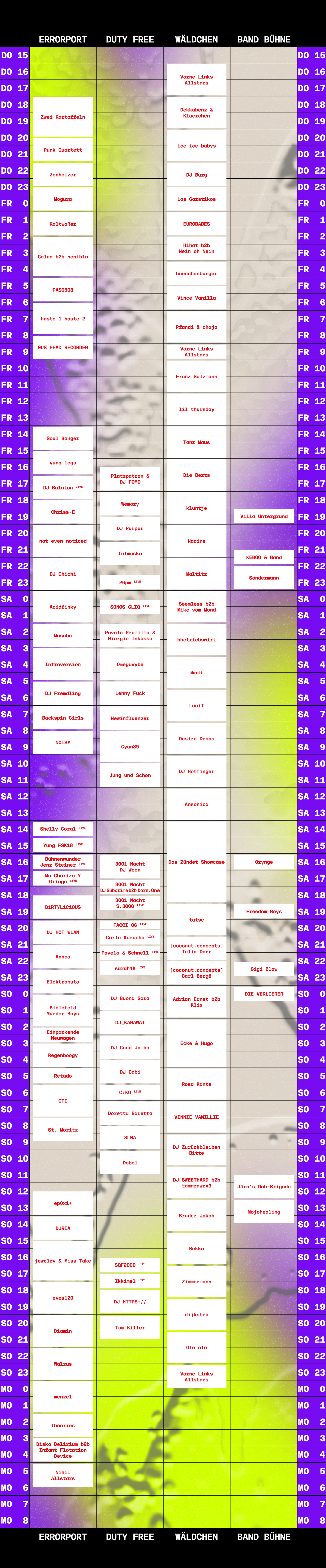 Die Artists werden in den kommenden Wochen bis zum Festival auf Instagram vorgestellt. Das gesamte Lineup werdet Ihr im Laufe der Vorbereitungen auf der Website finden. Das vollständige Programm, Lageplan und den Timetable bekommt Ihr kurz vor dem Festival als pdf zum Download bereitgestellt. Ein Link dazu wird hier eingefügt.
